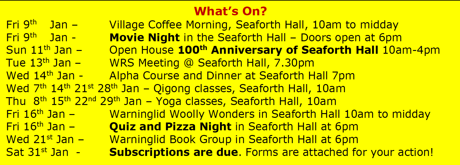 Fri 9th Jan – Village Coffee Morning, Seaforth Hall, 10am to midday Fri 9th Jan - Movie Night in the Seaforth Hall – Doors open at 6pm Sun 11th Jan – Open House 100th Anniversary of Seaforth Hall 10am-4pm Tue 13th Jan – WRS Meeting @ Seaforth Hall, 7.30pm Wed 14th Jan - Alpha Course and Dinner at Seaforth Hall 7pm Wed 7th 14th 21st 28th Jan – Qigong classes, Seaforth Hall, 10am Thu 8th 15th 22nd 29th Jan – Yoga classes, Seaforth Hall, 10am Fri 16th Jan – Warninglid Woolly Wonders in Seaforth Hall 10am to midday Fri 16th Jan – Quiz and Pizza Night in Seaforth Hall at 6pm Wed 21st Jan – Warninglid Book Group in Seaforth Hall at 6pm