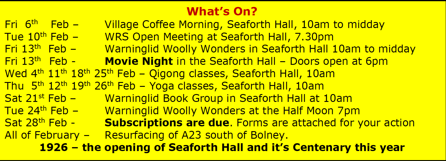Fri 6th Feb – Village Coffee Morning, Seaforth Hall, 10am to midday Tue 10th Feb – WRS Open Meeting at Seaforth Hall, 7.30pm Fri 13th Feb – Warninglid Woolly Wonders in Seaforth Hall 10am to midday Fri 13th Feb - Movie Night in the Seaforth Hall – Doors open at 6pm Wed 4th 11th 18th 25th Feb – Qigong classes, Seaforth Hall, 10am Thu 5th 12th 19th 26th Feb – Yoga classes, Seaforth Hall, 10am Sat 21st Feb – Warninglid Book Group in Seaforth Hall at 10am Tue 24th Feb – Warninglid Woolly Wonders at the Half Moon 7pm